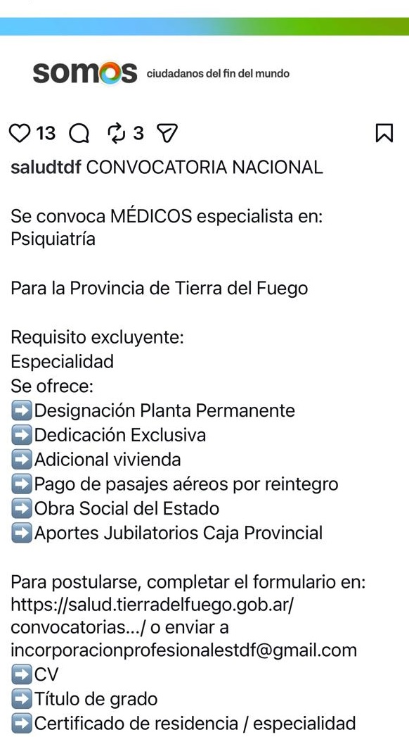 En el Hospital Alvear estamos buscando 3 psiquiatras para planta, 2 para la mañana (1 Inf -Juv) y 1 a la tarde. Los curriculum se presentan en el hospital (Warnes 2630, Rxursos Humanos) del 10 al 23/9. Publicado el: 04-09-2025